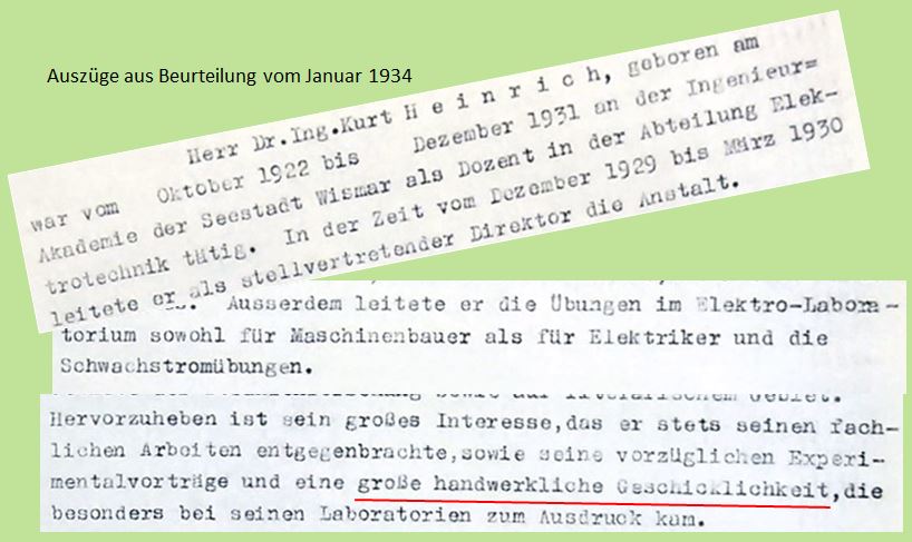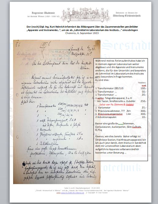 Im Jahre 1923 statte Heinrich in zwei Übergaben "sein" Elektrotechnisches Institut in Wismar umfassend mit Gerät und Material seines bis dahin in Chemnitz privat betriebenen Laboratoriums aus. Hier ein Auszug aus seinem Brief an das Wismarer Bildungsamt vom 6. September 1923 zum zweiten Teil der Übergabe: