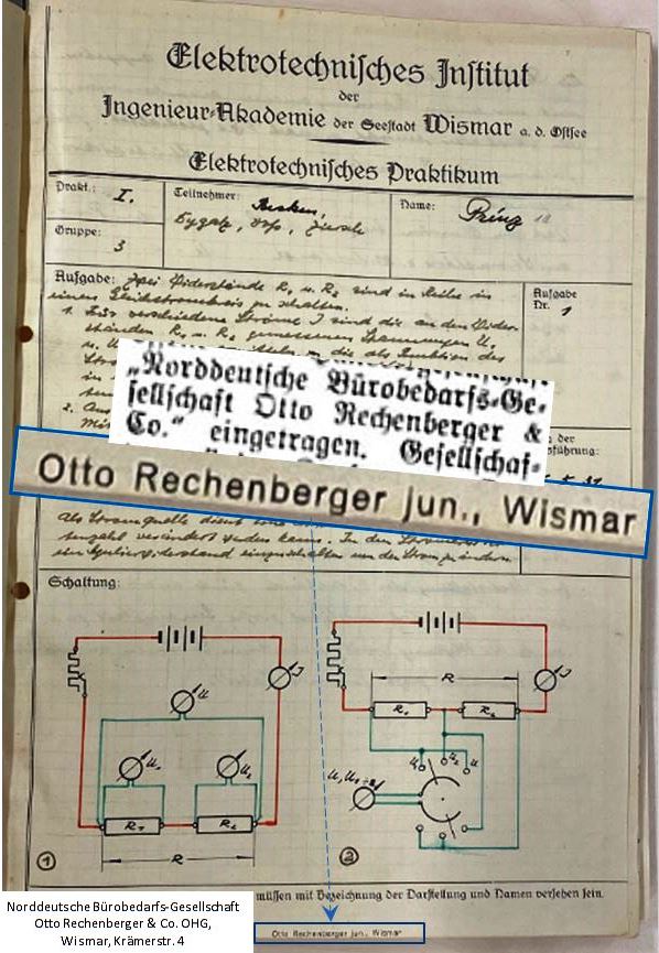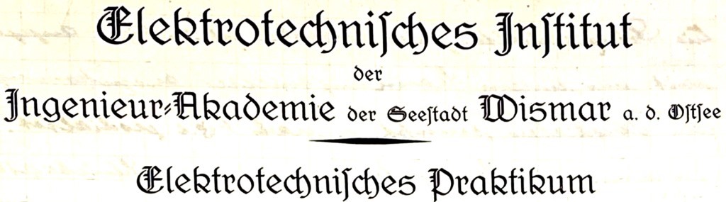 Das "Elektrotechnische Institut" ließ für die Studierenden entsprechende Praktikums-Hefte drucken. Augenscheinlich ein Druckauftrag, der hierfür über den Bürobedarf Otto Rechenberger jun. in Wismar (Krämerstr. 4, heute Reisebüro Karstadt) abgewickelt worden war.