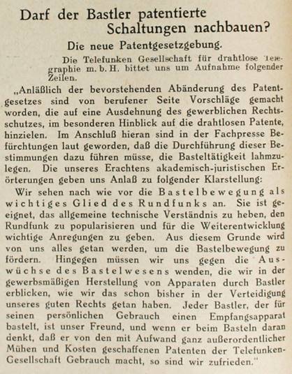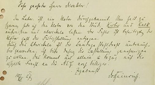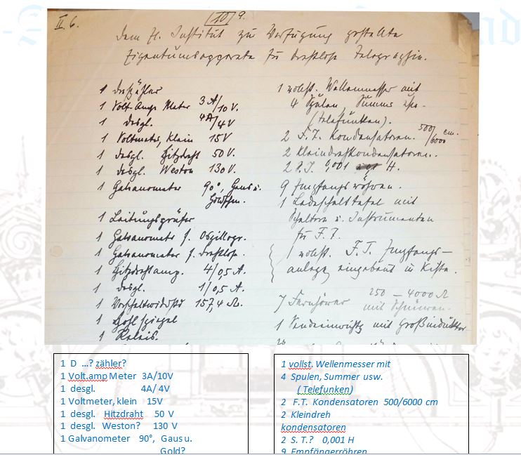 "Ebenso, wie dies bereits bisher erfolgt ist (drahtlose Station, Hochfrequenzapparate) bin ich auch jetzt bereit, dem Institut in Sonderheit dem mir unterstellten Laboratorium oben aufgeführte Apparate selbstverständlich kostenlos unter Betonung meines Eigentumsrechtes leihweise zur Verfügung zu stellen, sofern das Besoldungsamt mit dem Einverständnis sowohl mein Eigentumsrecht anerkennt als auch die Kosten des Transportes (Frachtgut mit Versicherung) übernimmt...