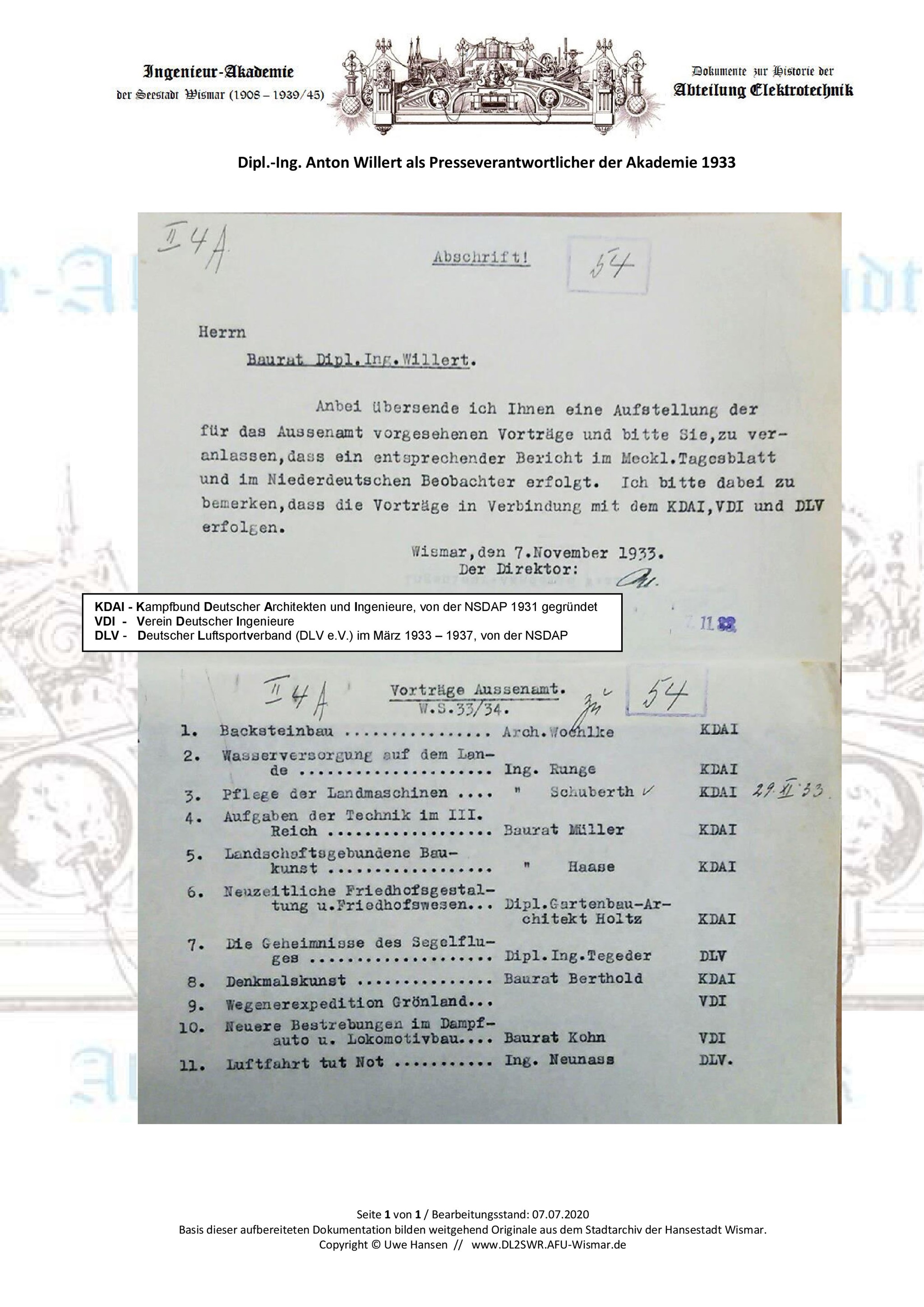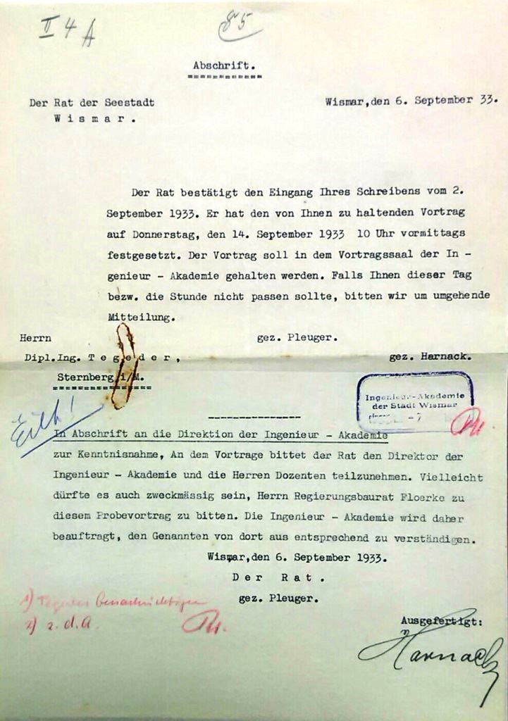 Einladungsschreiben des Bürgermeisters Pleuger vom 6. September 1933 an Dipl.-Ing. Tegeder zur Probevorlesung. Durchschlägig werden mit diesem Schreiben der Direktor und alle Dozenten der Akademie zur Teilnahme aufgefordert, mit dem Verweis auf die erwartete Anwesenheit des Regierungsbaurats Floerke.