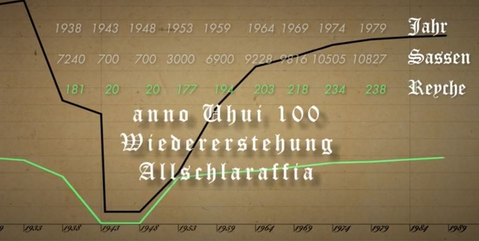 Die Schlaraffen, auch ein weltweiter Männerbund, zur Pflege von Freundschaft, Kunst und Humor („… ausschließlich Männer in gesicherter Position …“), treffen sich zu "Sippungen" in der sogenannten Winterung (Nordhalbkugel: 1. Oktober bis 30. April; Südhalbkugel: 1. Mai bis 30. Oktober) einmal pro Woche an einem festgelegten Wochentag in ihrer „Schlaraffenburg“, dem im Stil eines mittelalterlichen Rittersaales ausgestatteten Vereinslokal. Diese Zusammenkünfte werden nach festgelegtem Zeremoniell in Form eines Ritterspieles mit wohldurchdachten Regeln in zwei Teilen – einem im Ablauf stets gleichen, auf wiederkehrende Regularien bedachten ersten und einem freier zu gestaltenden, eher künstlerischen zweiten – abgehalten. (Quelle: Wikipedia) Für besonders Interessierte empfehle ich dieses Jubiläumsvideo 150 Jahre Allschlaraffia von 2009 (Quelle: https://www.schlaraffia.org), was mir zur Vorstellung der Schlaraffias sehr gut geeignet scheint.
