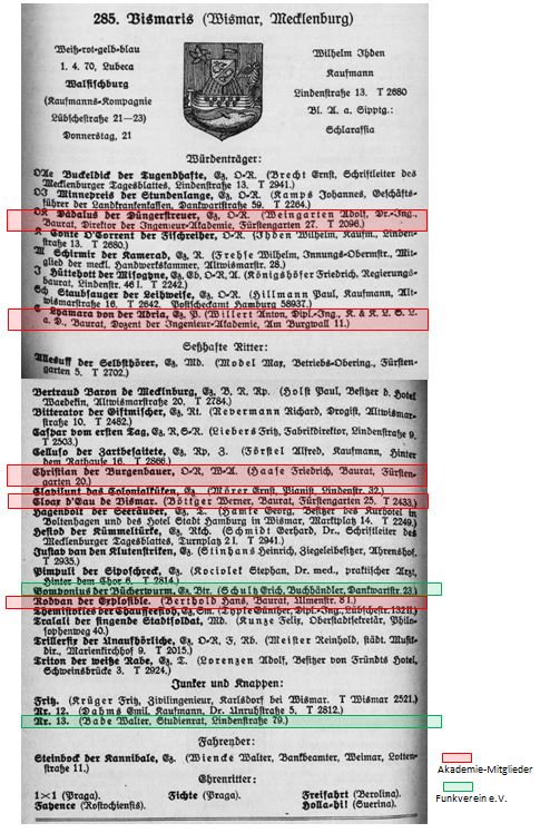 In der Stammrolle der Schlaraffia Vismaris vonn 1931 sind mindestens diese zwei Dozenten der Ingenieur-Akademie (Dr.-Ing. Adolf Weingarten, Dankwartstr. 59 und Dipl.-Ing. Anton Willert, Am Burgwall 11) zu finden. Darüber hinaus die Bauräte Dipl.-Ing. Friedrich Haase, Dipl.-Ing. Werner Böttger und Dipl.-Ing. Hans Berthold. Bekannt aus dem Funkverein Wismar e.V. bekannte Buchhändler Erich Schultz in der Dankwartstr. 23 und der Gymnasiallehrer Studienrat Walter Bade aus der Lindenstr. 79.