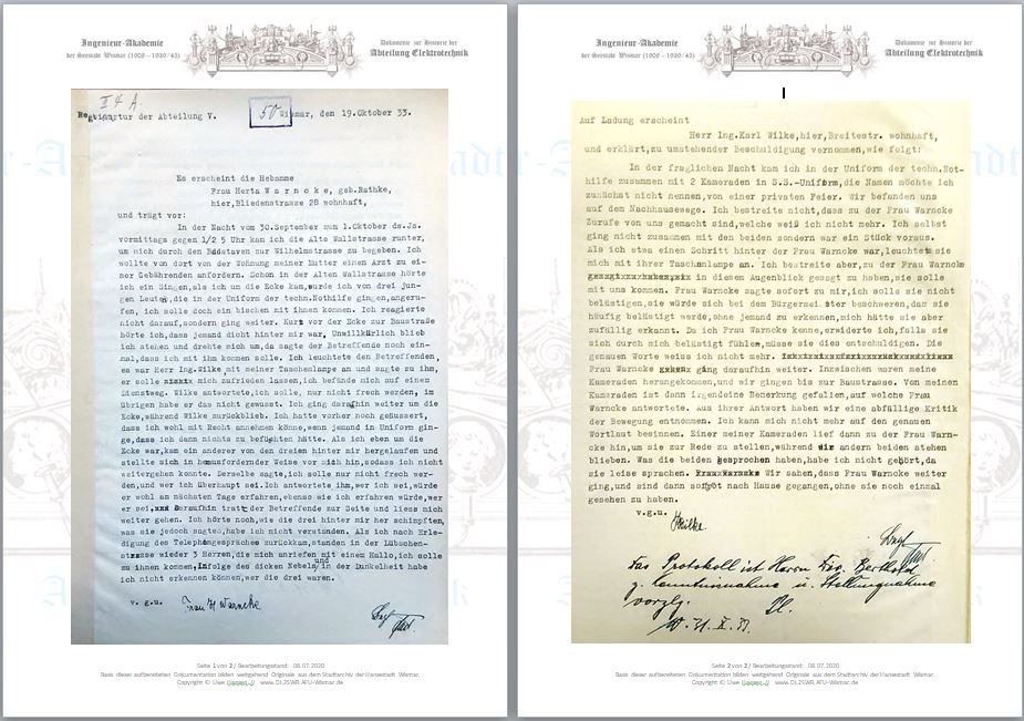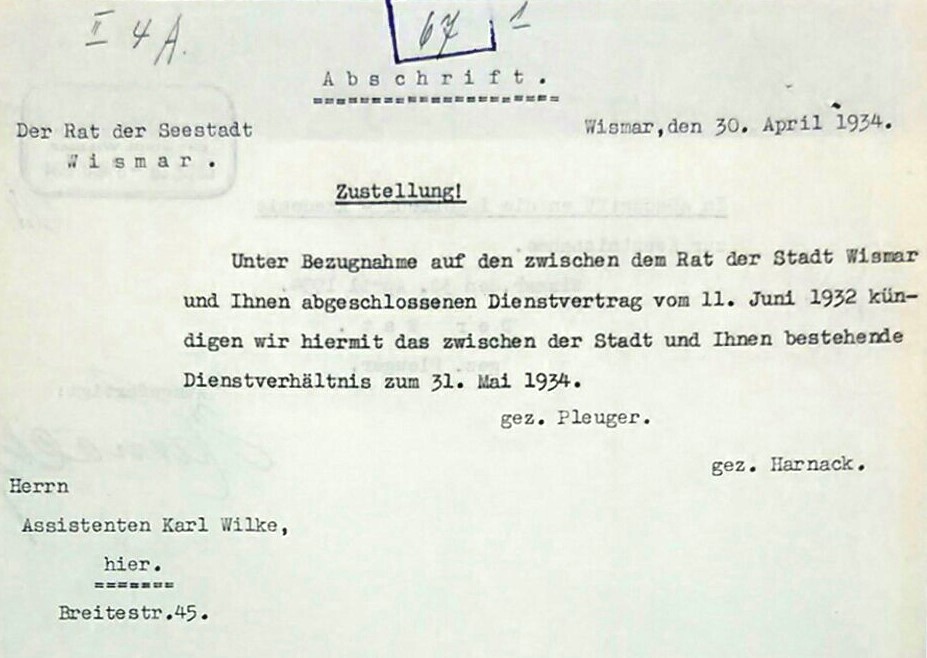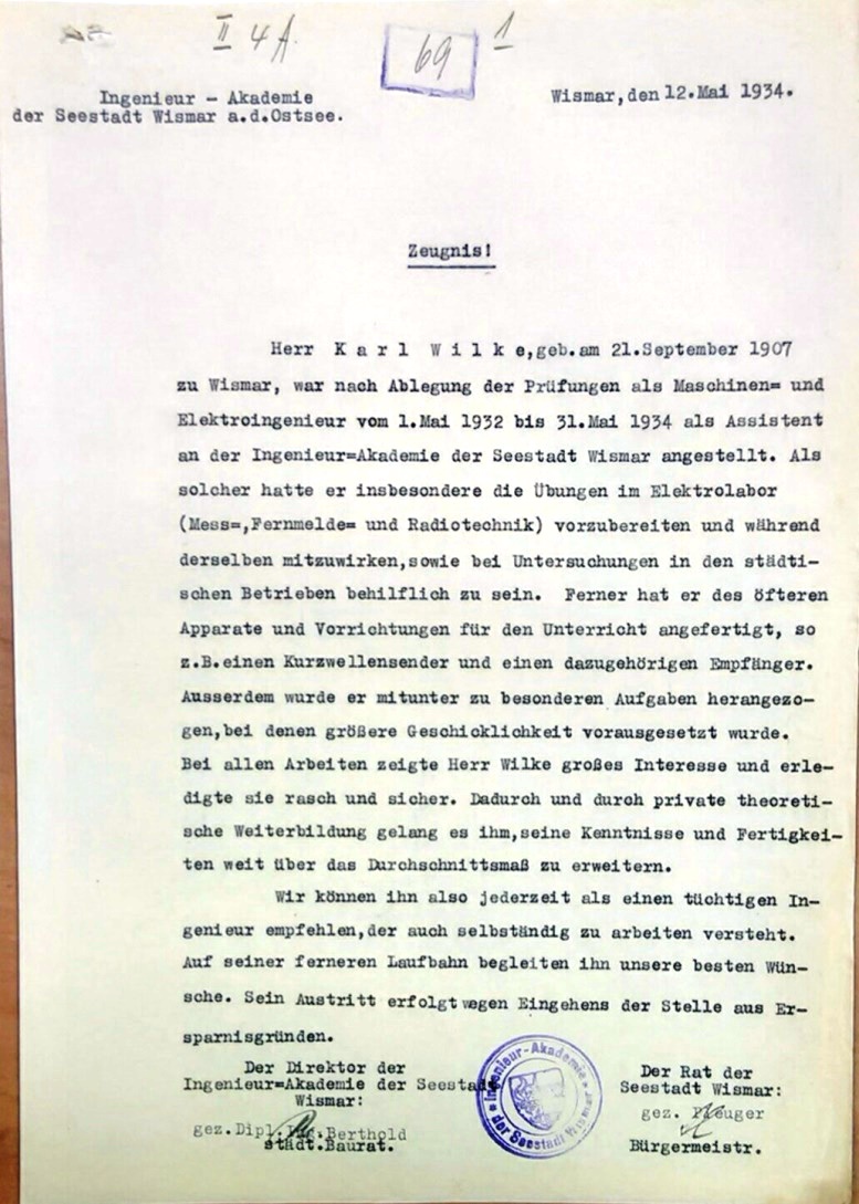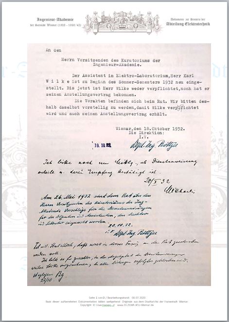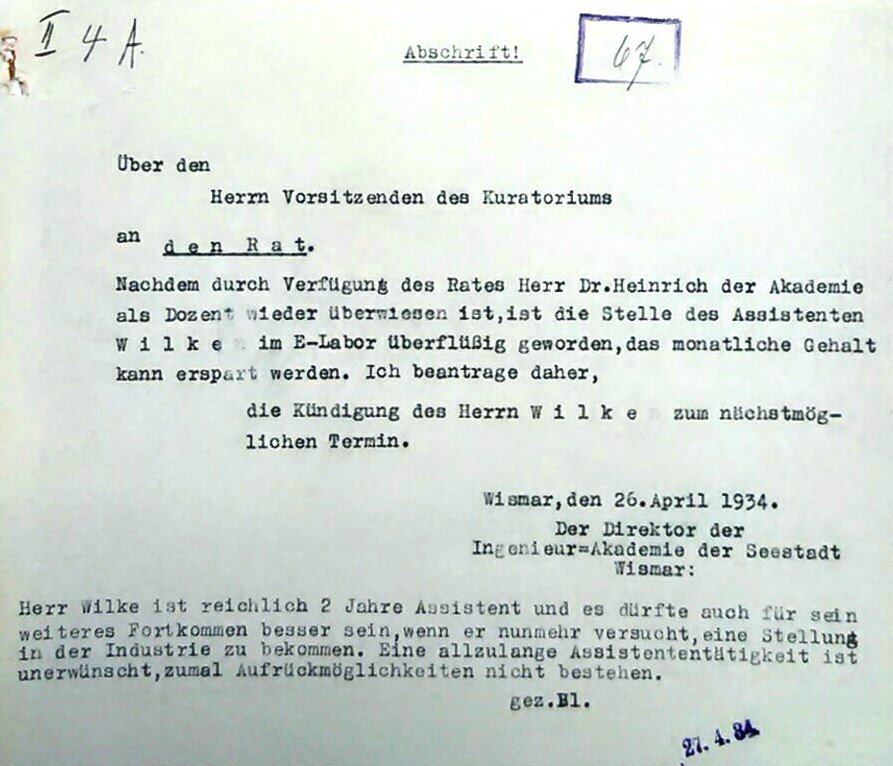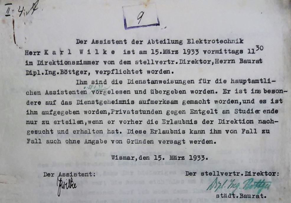 Karl Wilke war ein gebürtiger Wismarer (Breitestr. 45 / 1937 ist hier ein Schmied Franz Wilke gemeldet, Vater?) und am 21. September 1907 geboren. Er begann sein Studium an der Wismarer Akademie noch unter Dr.-Ing. Heinrich. Wilke war gleich nach seinen Abschlussprüfungen als Maschinen- und Elektroingenieur von der Akademie übernommen und als Assistent der ET vom 1. Mai 1932 - 31. Mai 1934 insbesondere für die Übungen (Praktika) im Elektrolabor angestellt worden. Im Oktober 1932 verfügte er immer noch über keinen Anstellungsvertrag, den Direktor Böttger nun beim Kuratorium einforderte. Am 15. März erfolgte die Verpflichtung Wilkes.