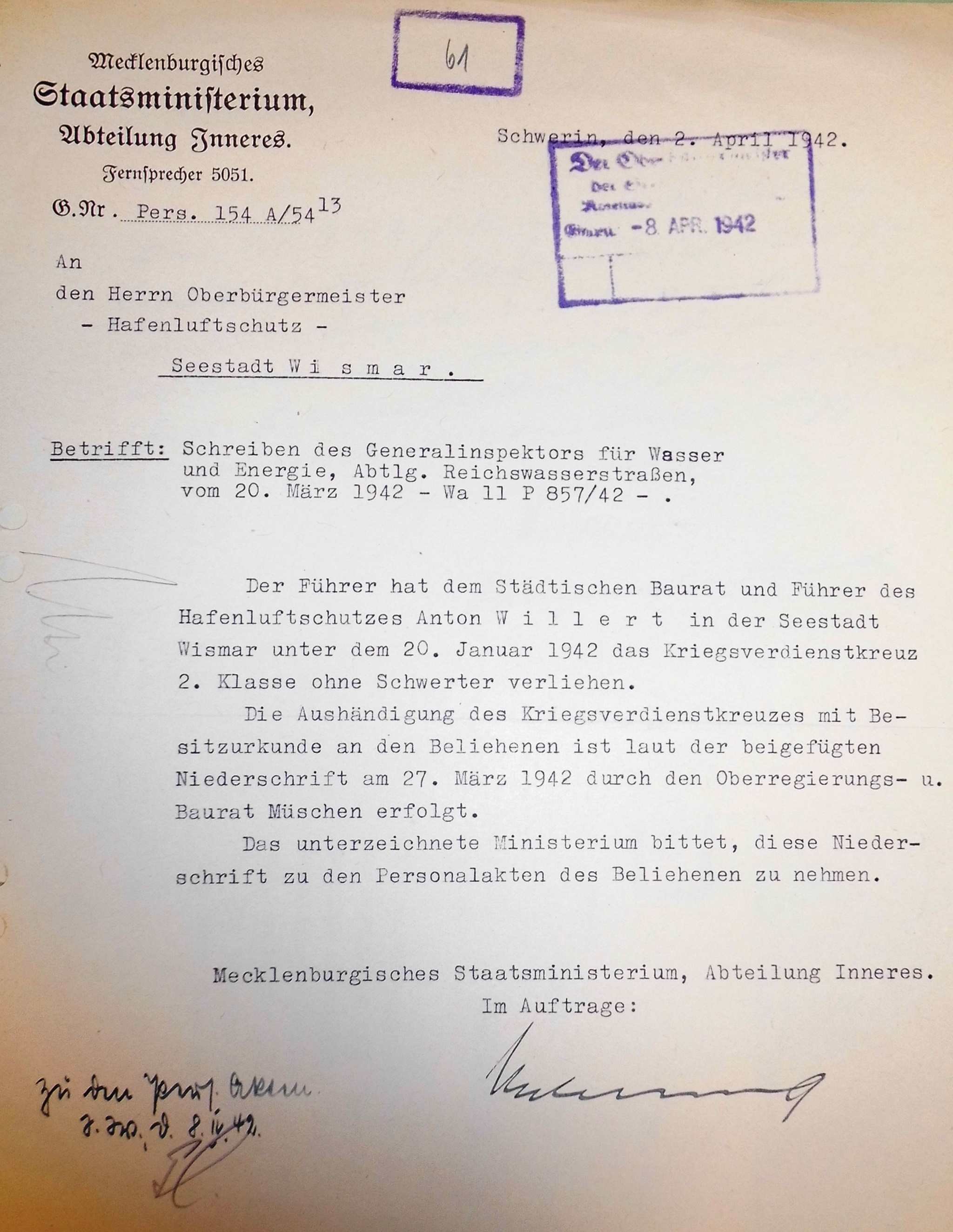 Als Beamter war Willert in der Seestadt Wismar zum Führer des Hafenluftschutzes berufen worden. Seine Verdienste dabei wurden am 20. Januar 1942 mit dem Kriegsverdienstkreuz 2. Klasse ohne Schwerter honoriert, womit in der Folgezeit aber auch andere Dozenten (Dozent Hilse am 30. Januar 1944) geehrt wurden. 1944 war das Schreiben allerdings schon kürzer ausgefallen...