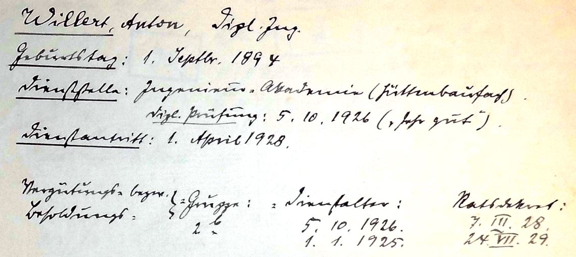 Anton Willert, ein österreichischer Staatsbürger, wurde am 1. September 1894 in Teplitz-Schönau (im heutigen Tschechien/Böhmen) geboren. Als „…österreichischer Staatsuntertan“ und "...Kapitän weiter Fahrt" (ehemaliger Fregattenkapitän der k&k Kriegsmarine der Österreichisch-Ungarischen Monarchie), seit dem Ende des I. WK in Berlin lebend, bewarb sich der Dipl.-Ing. Anton Willert im Frühjahr 1928 auf eine Stellenanzeige der Wismarer Akademie in der VDI-Zeitschrift (Verein Deutscher Ingenieure) als Dozent für Mathematik und naturwissenschaftliche Fächer. Sein Vater, Anton Willert senior, war Ingenieur Chemiker (vom Junior hier so benannte Berufsbezeichnung) und Direktor der örtlichen Staatsfachschule Keramik und verwandte Kunstgewerbe.