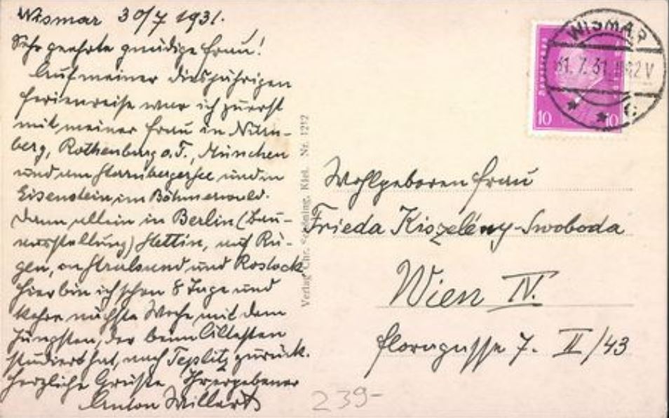 Vorderseitig der Heilig-Geist-Hof mit Ingenieur-Akademie in bester Druck-Qualität. Doch die Sensation auf der Rückseite: mit einer Friedrich-Ebert-Briefmarke frankiert die Unterschrift eines Anton Willerts! Und tatsächlich. Der Senior Anton Willert schilderte am 30. Juli 1931 einer Hochgeborenen Frau Frieda Kiszelény-Swoboda in der Floragasse 7 in Wien seine jährliche Sommerurlaubs-Rundreise, die ihn zunächst gemeinsam mit seiner Frau durch den Süden Deutschlands führte. Im Weiteren bereiste er allein die Städte Berlin, Stettin, die Insel Rügen, Stralsund, Rostock und abschließend nun Wismar, um dann mit seinem Jüngsten, der beim Ältesten studiert hatte, nach Teplice zurückzufahren.
