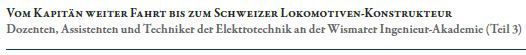 Es geht um... Weitere Dozenten, Assistenten und Techniker der Elektrotechnik an der Wismarer Ingenieur-Akademie und handelt "Vom Kapitän weiter Fahrt bis zum Schweizer Lokomotiven-Konstrukteur".